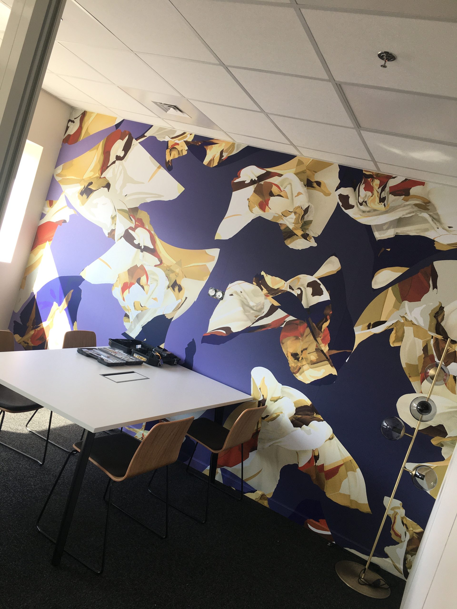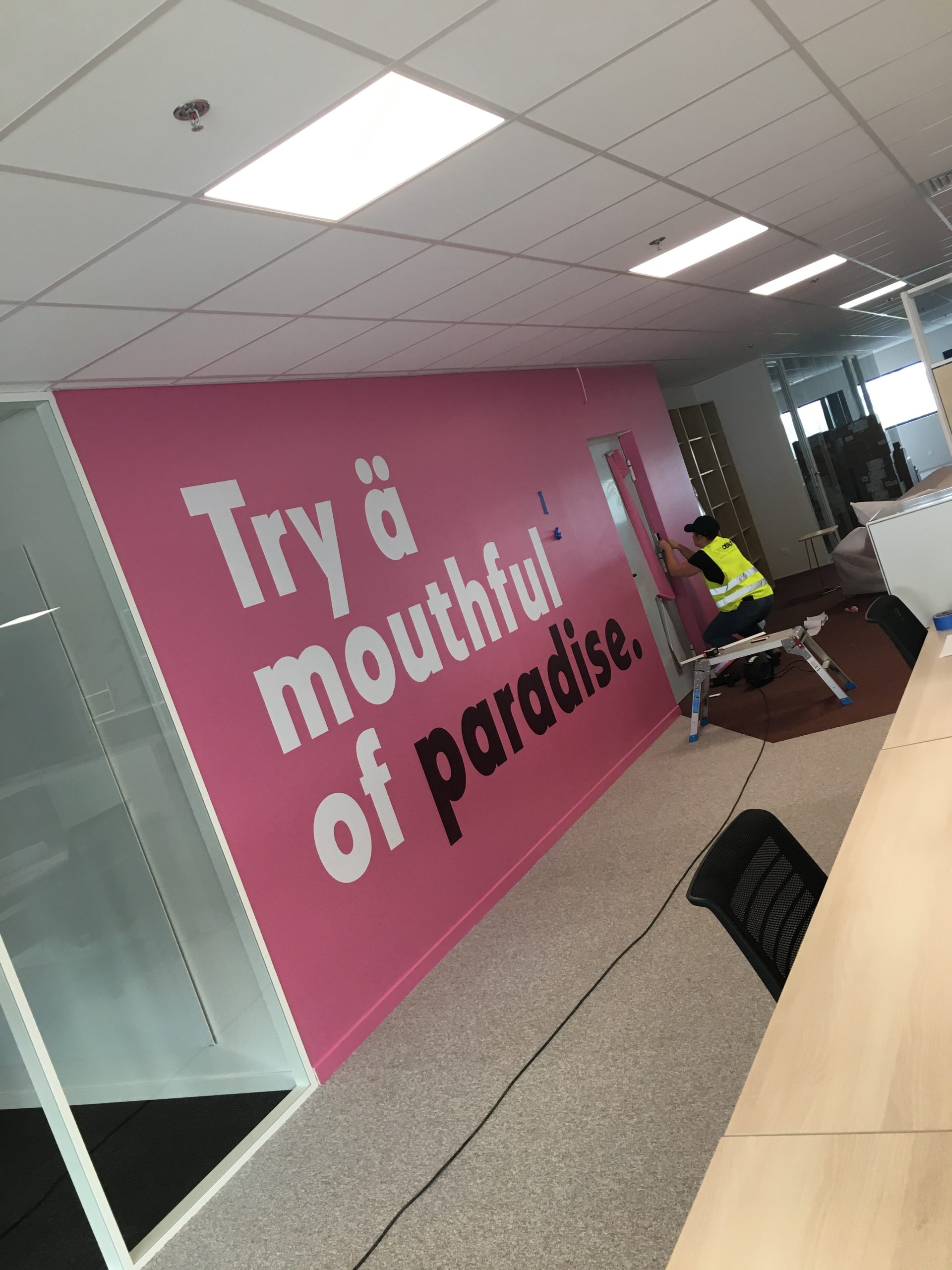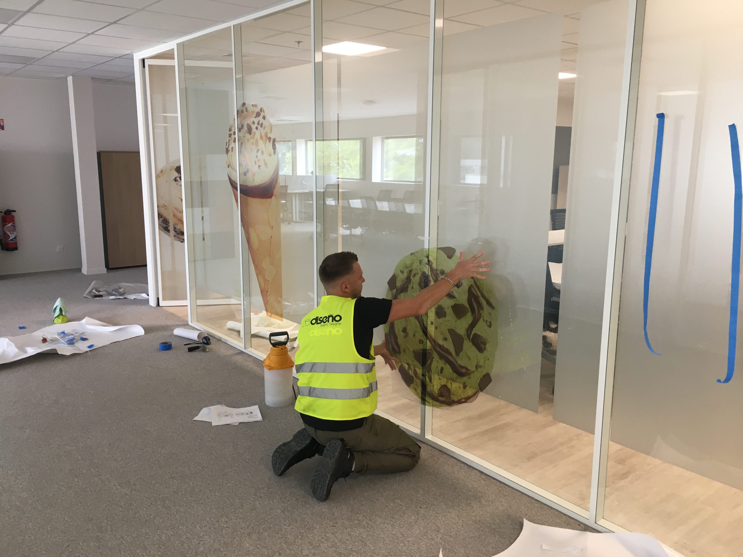 Réalisation de la décoration intérieure des bureaux HAAGEN DAZS à coté d’Arras, impression pour décoration mural, vitrophanie, lettre découpé, impression sur toiles, signalétique…